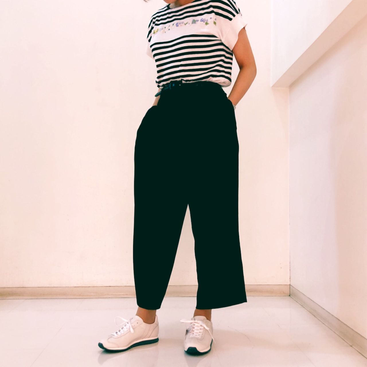 モノトーンのマリンボーダーに合わせて。爽やかな夏のコーディネートにぴったりです!