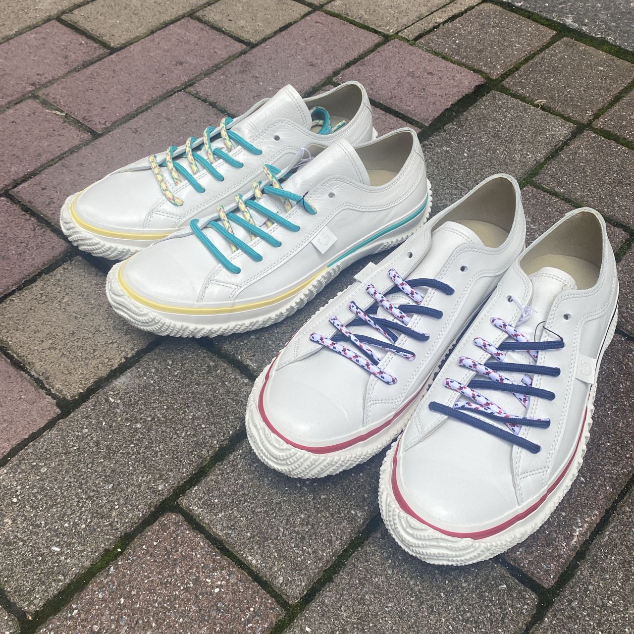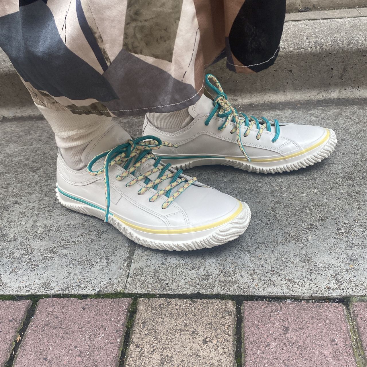 軽くて丈夫なカンガルーレザーに、リバーシブルの靴紐と2色のラインが入ったソールが映えるローカット。