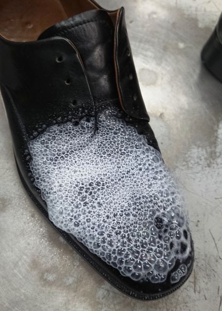 スプレーで発泡性の液体が出てきて、革の表面の汚れや、古い靴クリームを浮き上がらせます。