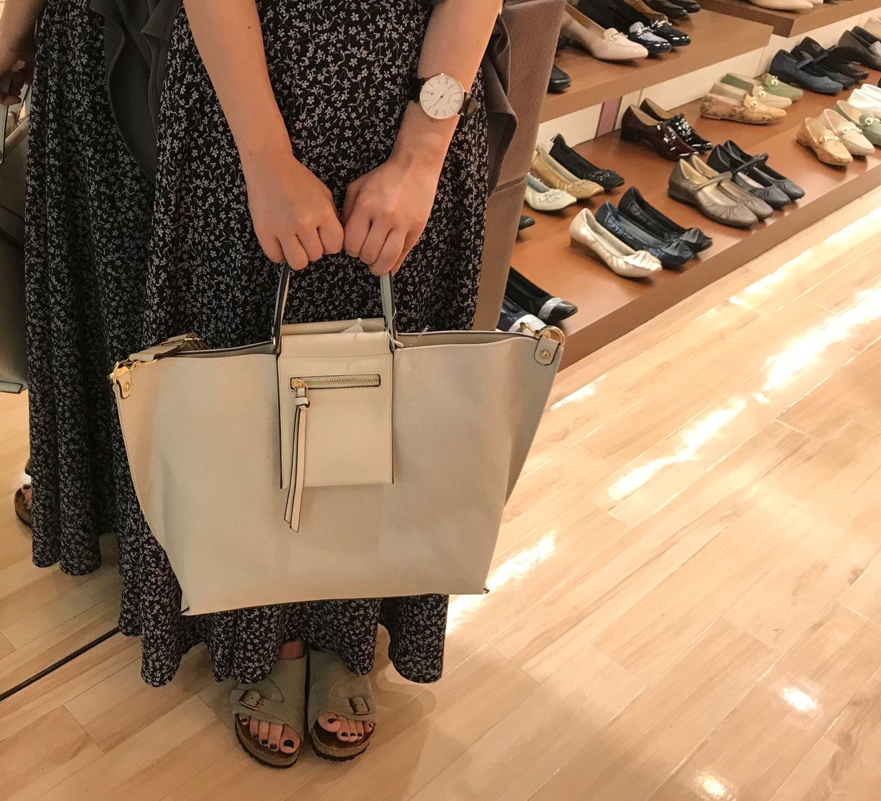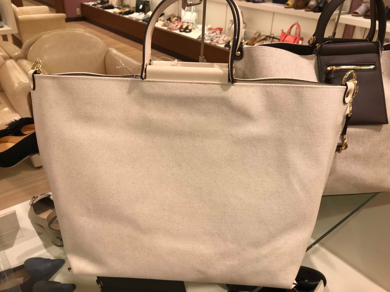 取り外しできるショルダーがついているのでお荷物が増えた時や、両手を開けたい時には、便利ですよ☆