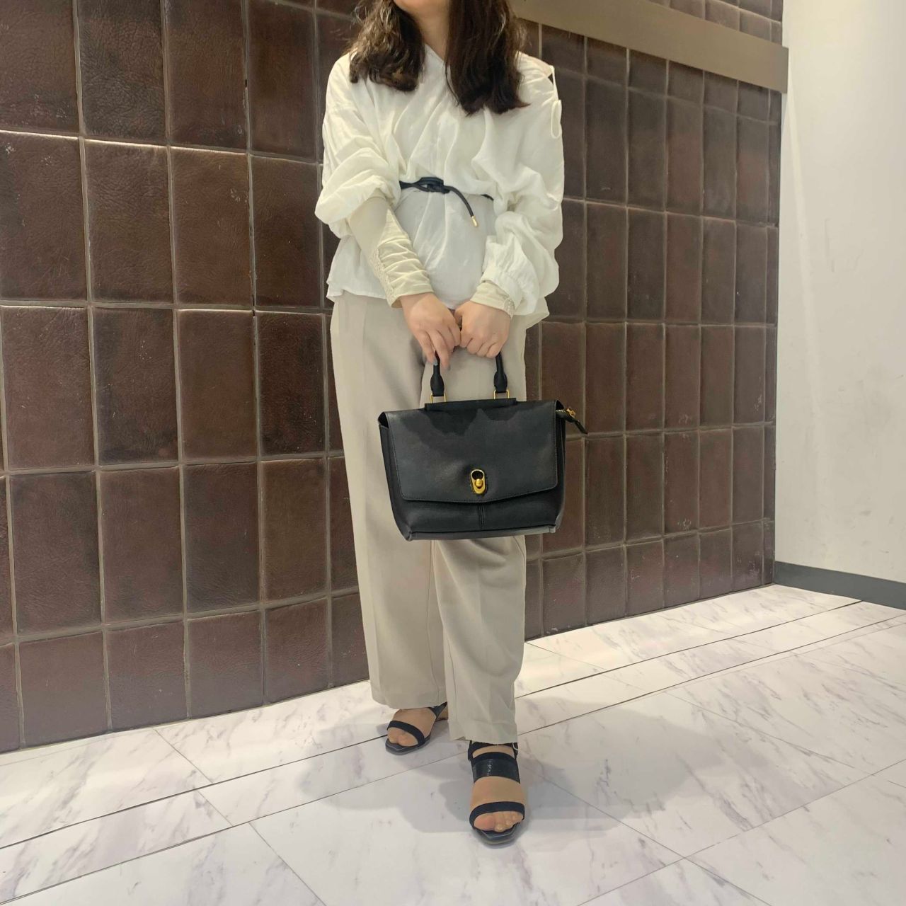 ベルトや、バッグに黒を使うと統一感が出て、夏でも重たくなりすぎずに履いて頂けます。