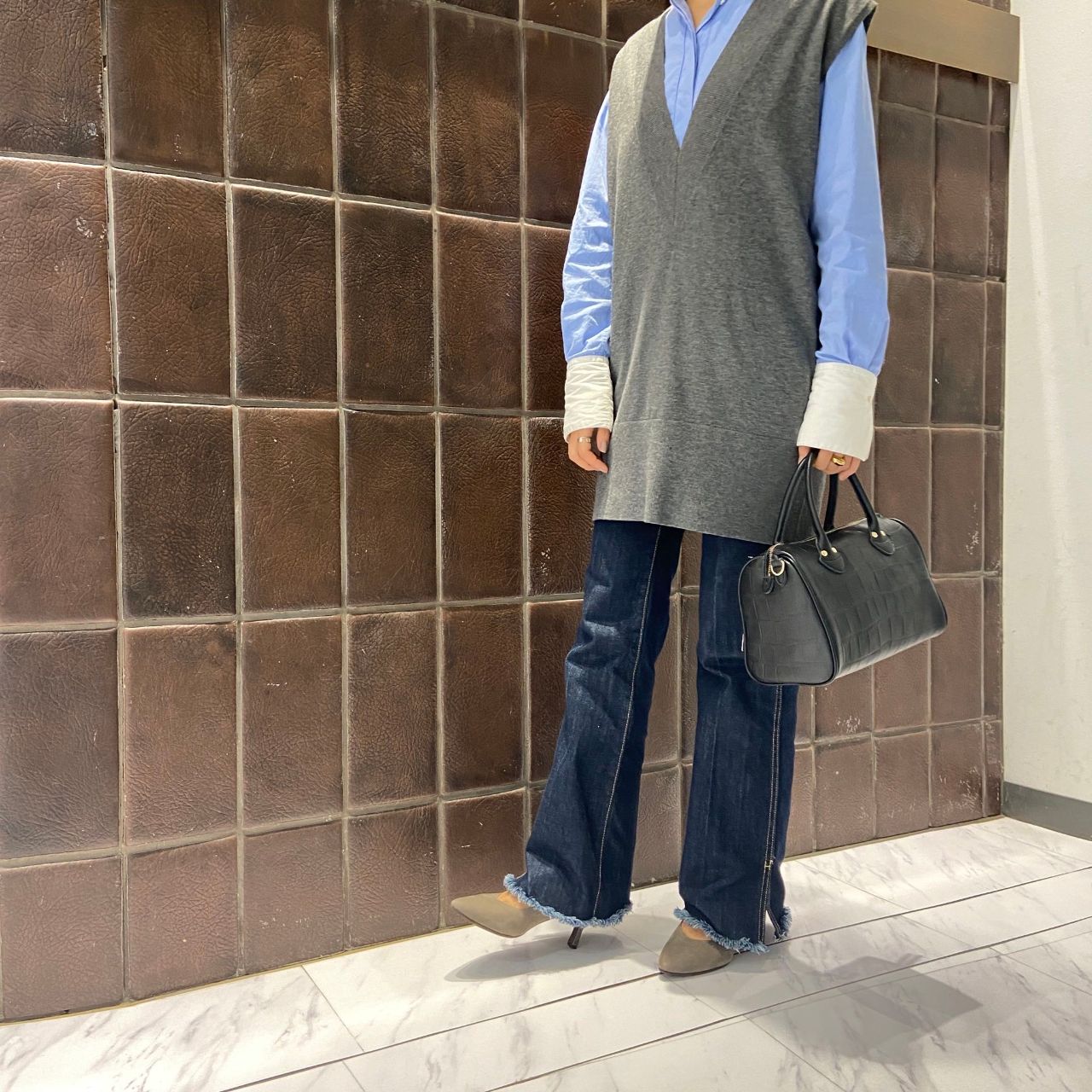 同色のグレーのトップスと合わせて大人な落ち着いた印象に◎