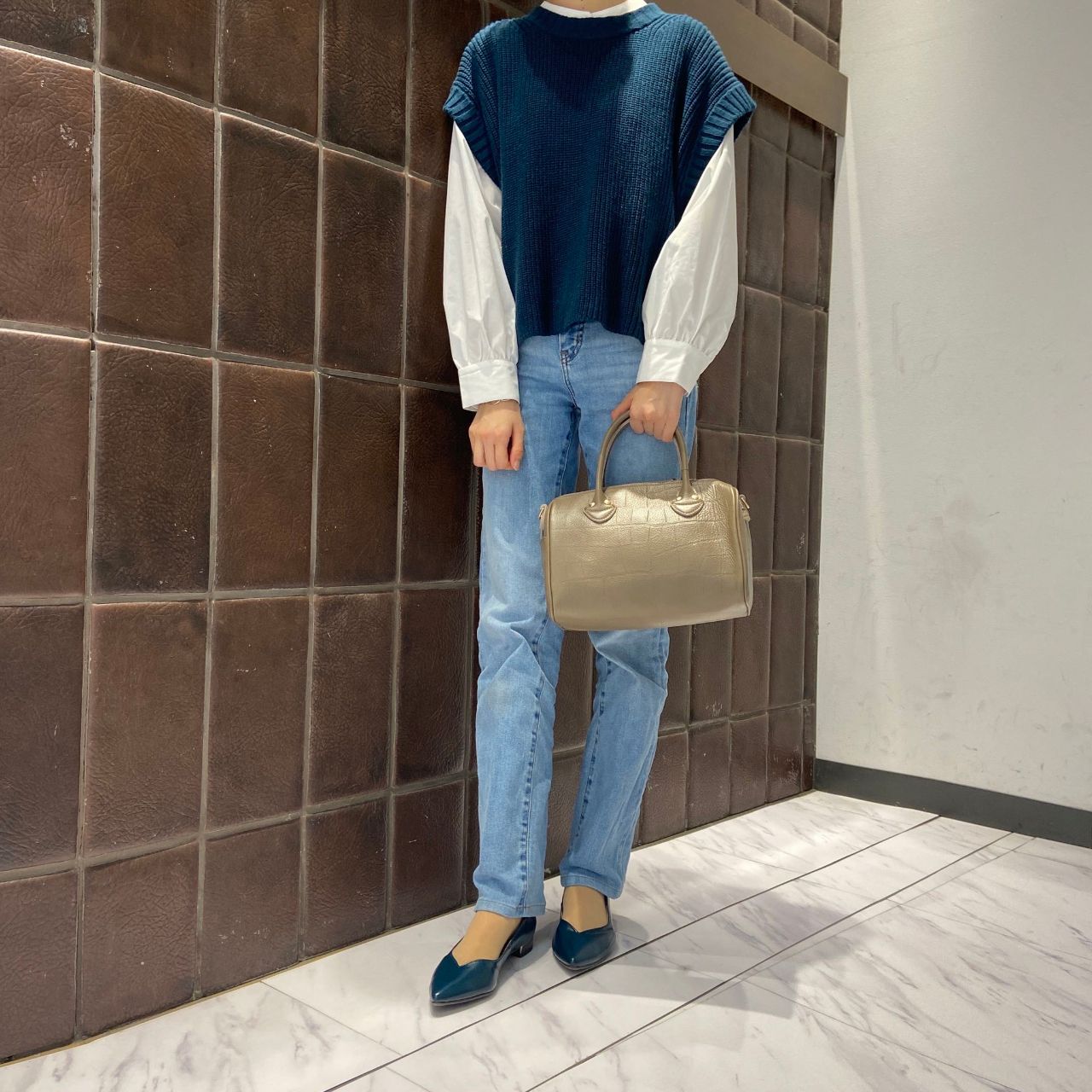 ゆったりとした履き心地の為、普段よりワンサイズ下で履いてみました。クッション性もあり、安定感のあるヒールで履きやすくなっています。