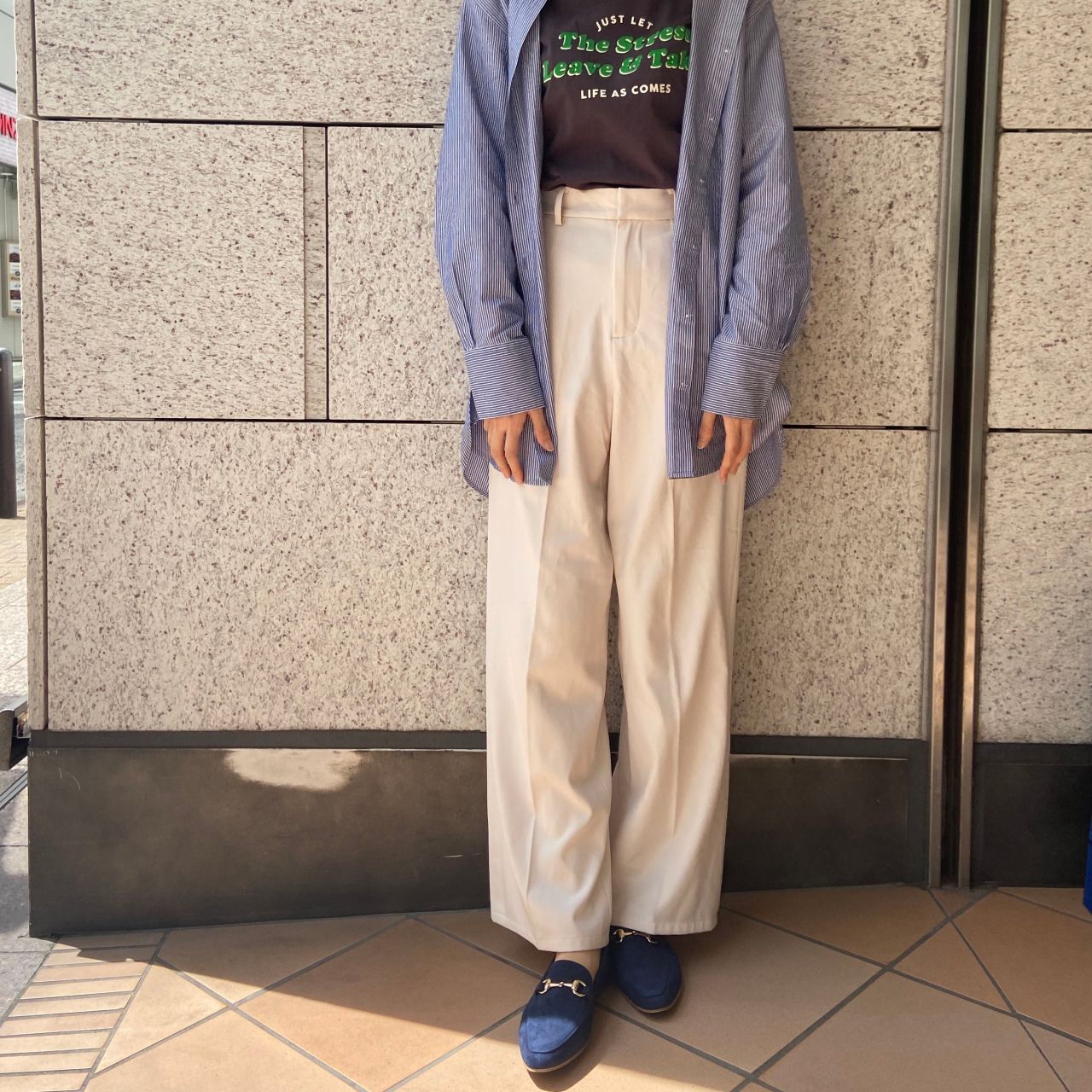 ホワイトのパンツと合わせて、大人爽やかコーデにも。