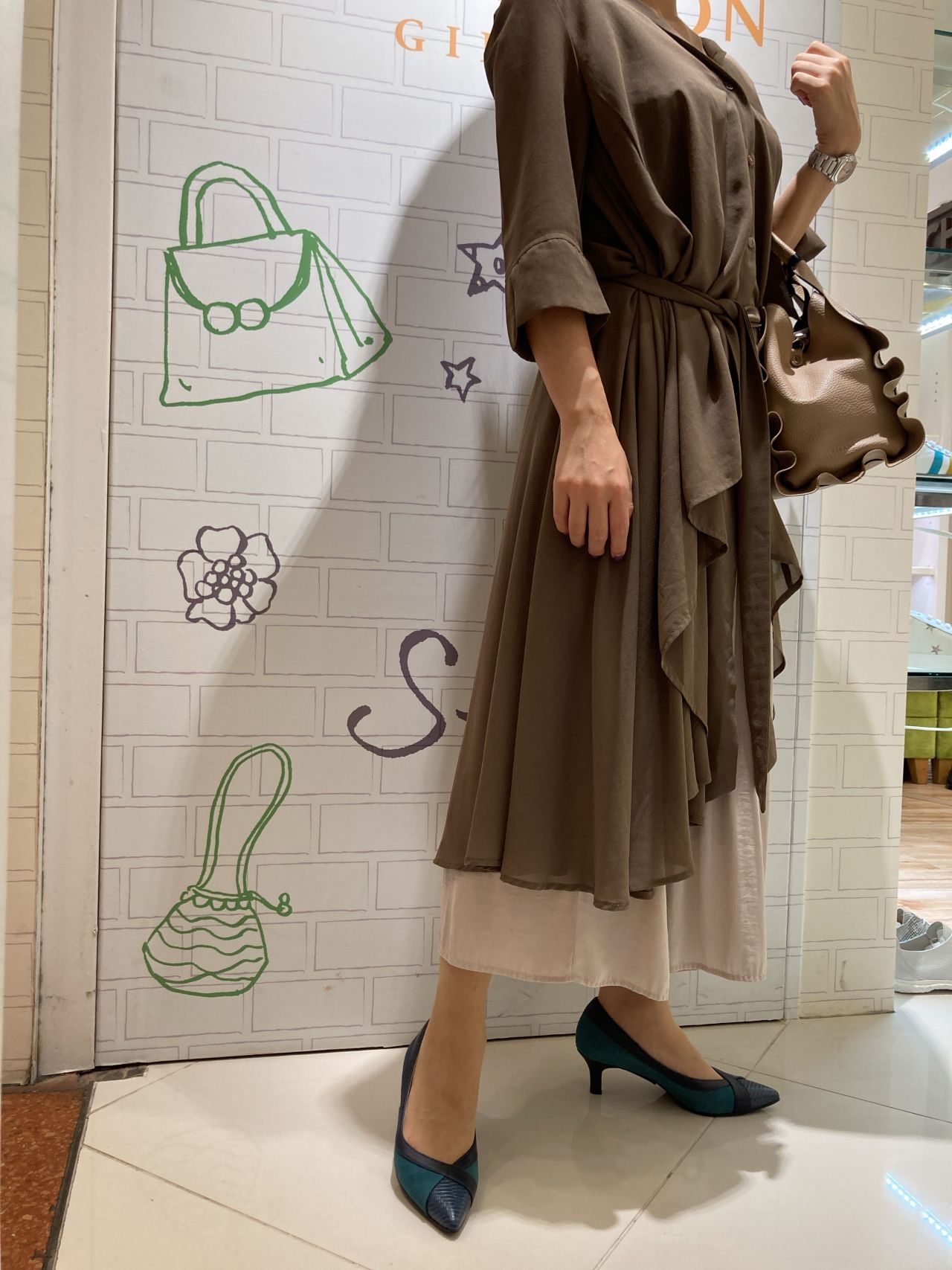 カーキのシャツワンピと合わせて。ワントーンコーデにワンポイントとして履いて頂くのもオススメです
