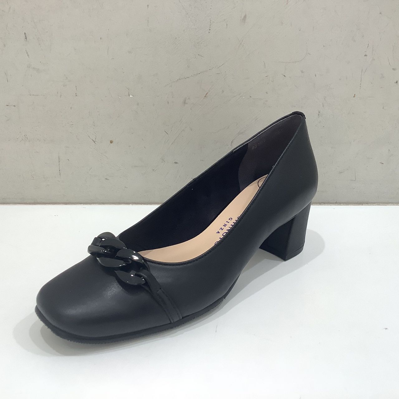 丸みのあるソフトスクエアのトウに、フロントには小ぶりのチェーンデザインがアクセントに☆