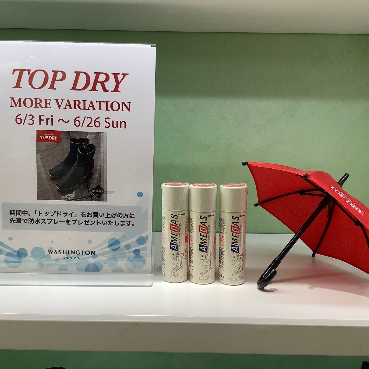 6/3(金)〜6/26(日)の期間中、TOP DRYお買い上げのお客様に先着で防水スプレーを差し上げます。