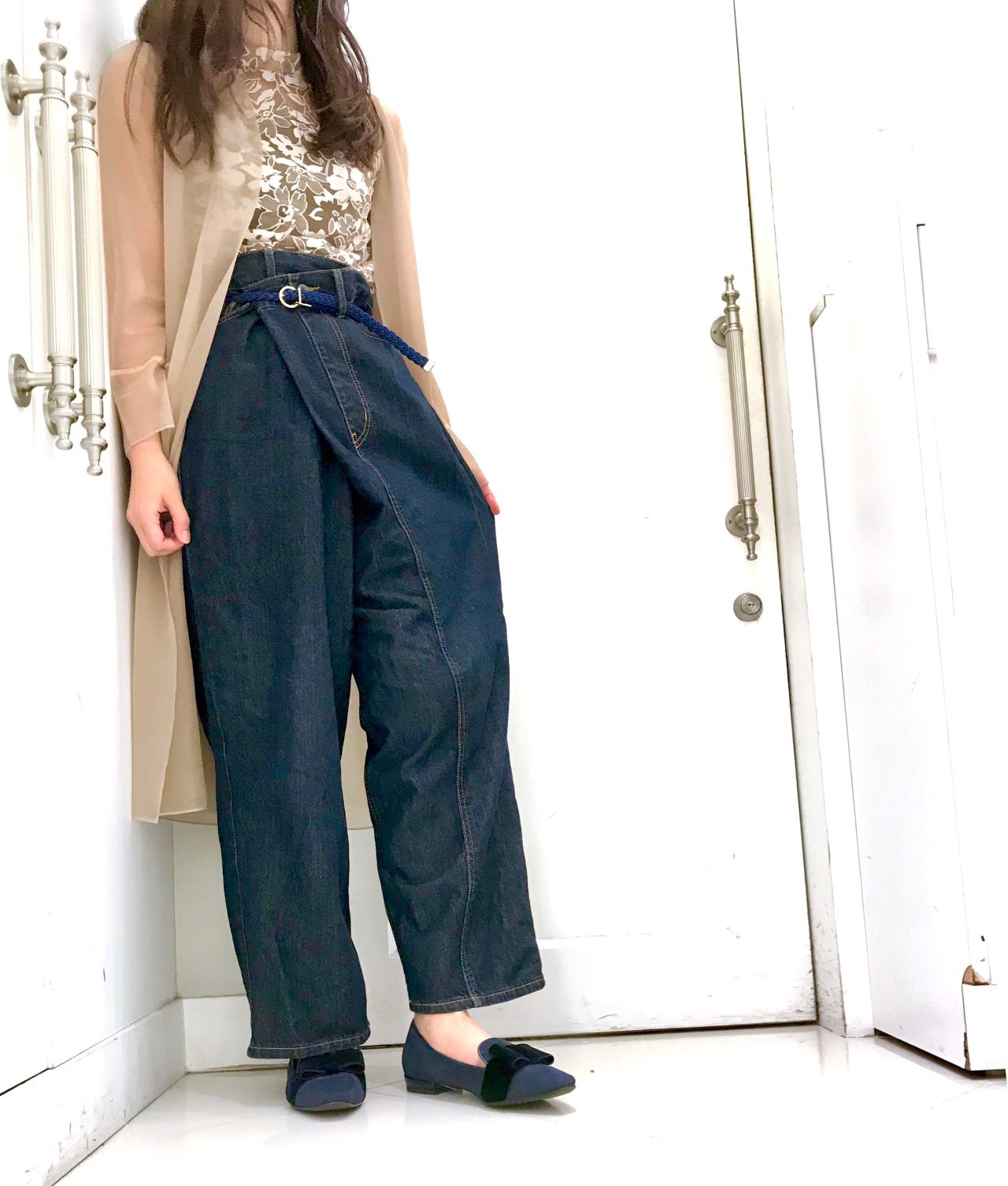 デニムのワイドパンツのゆるめな遊び心を