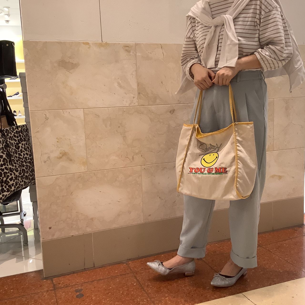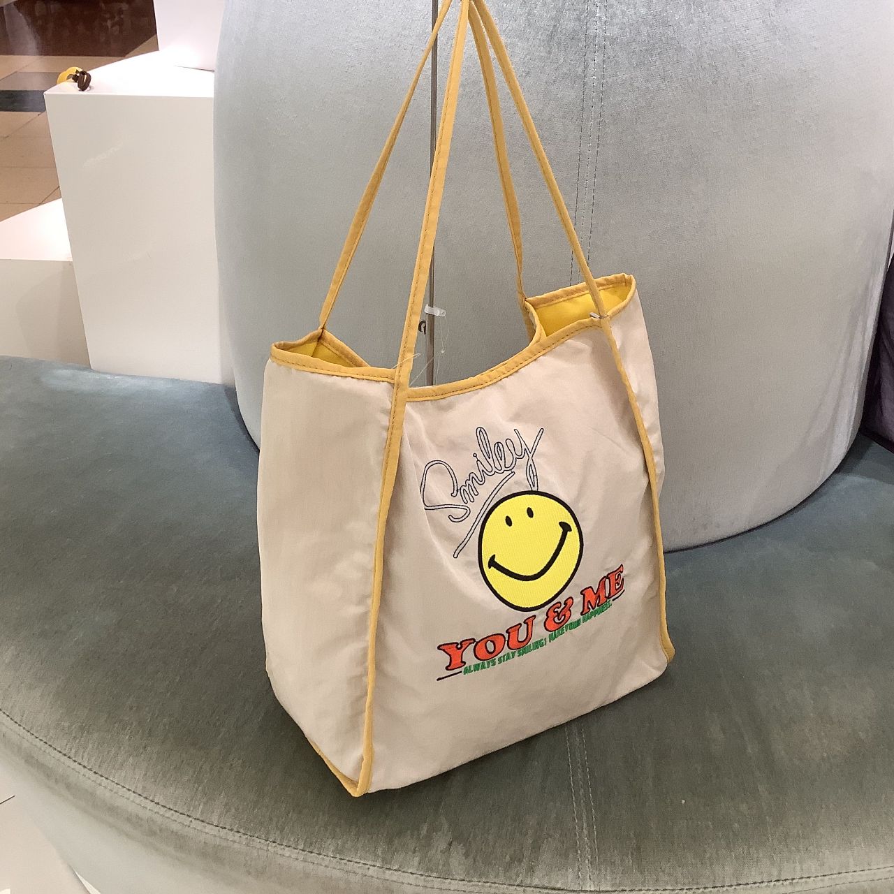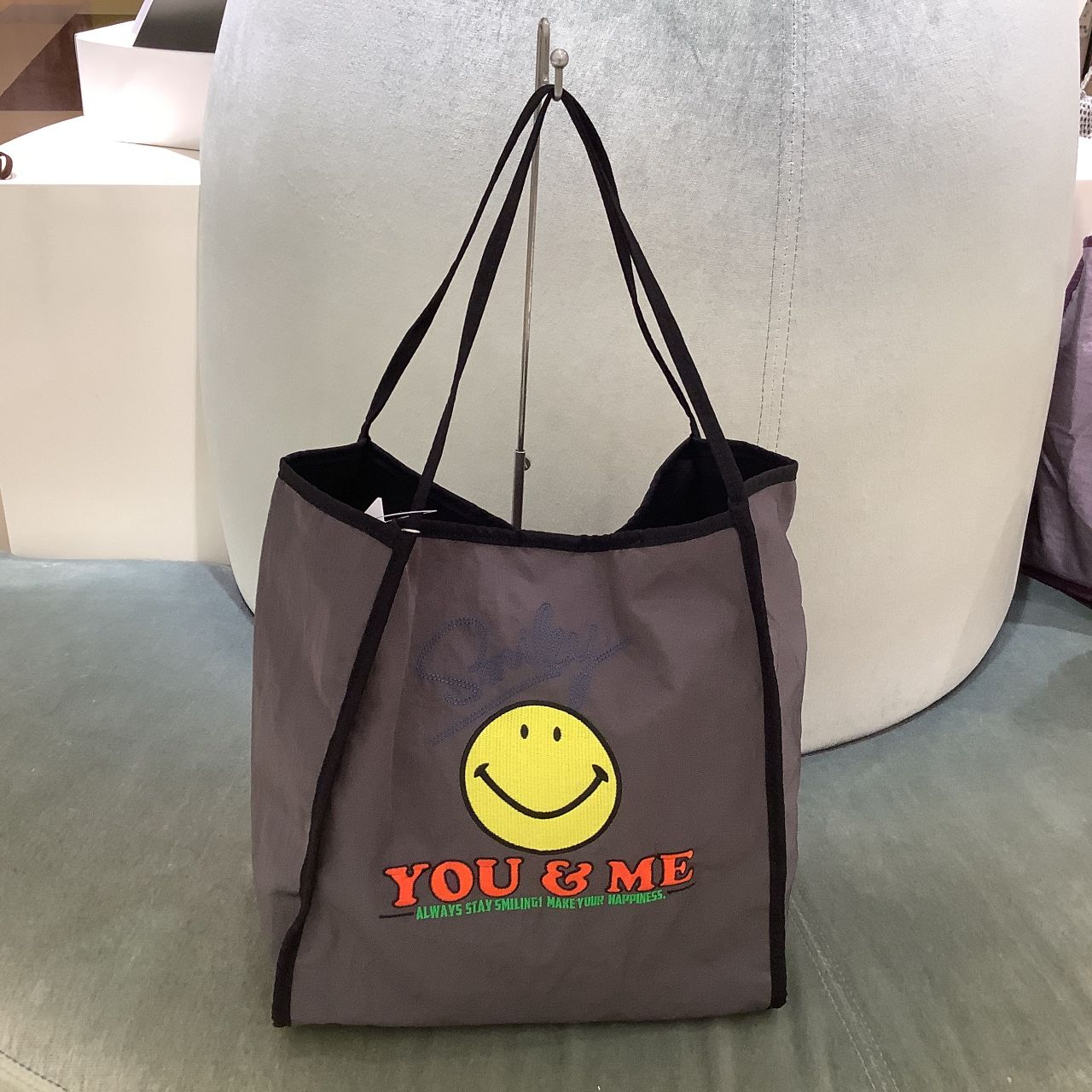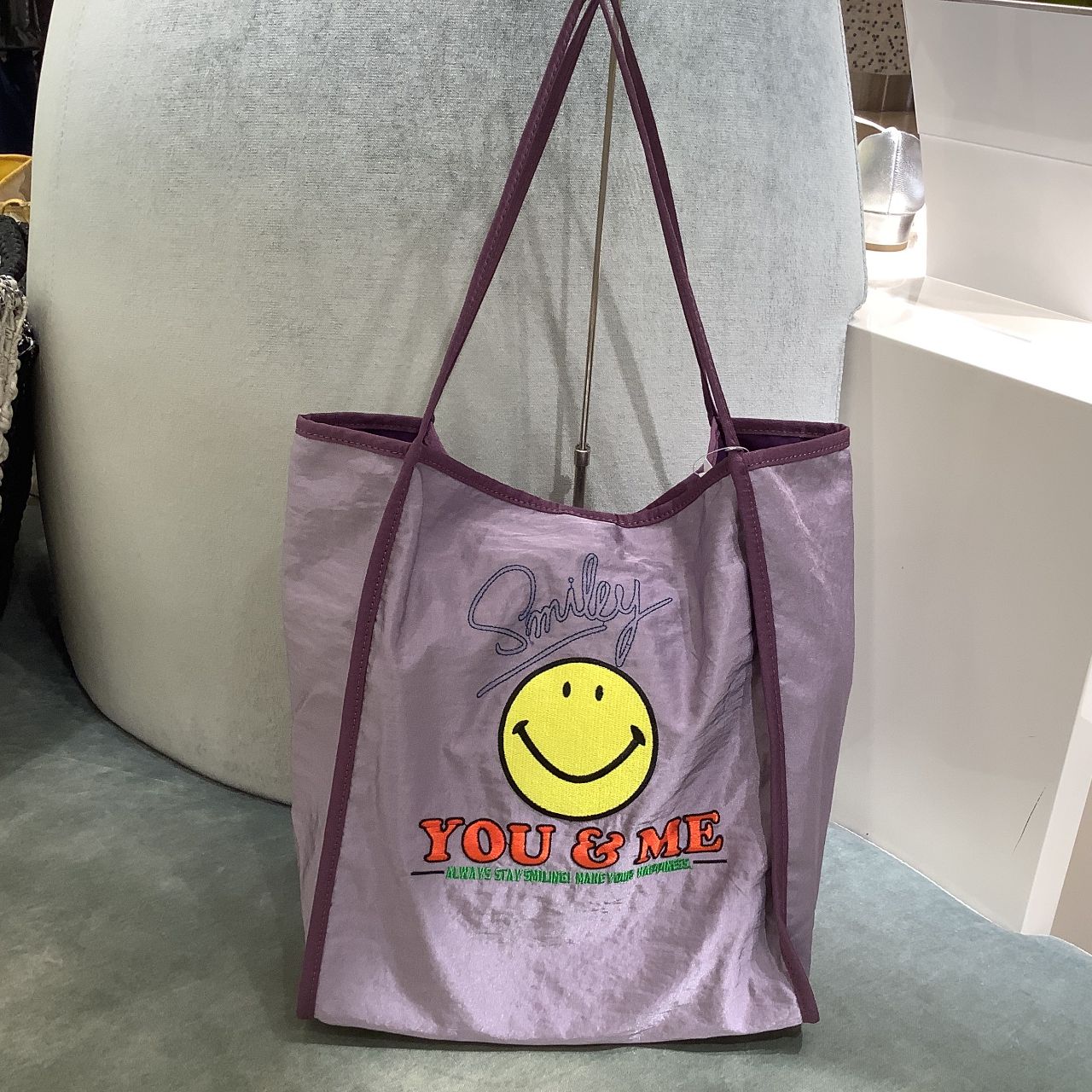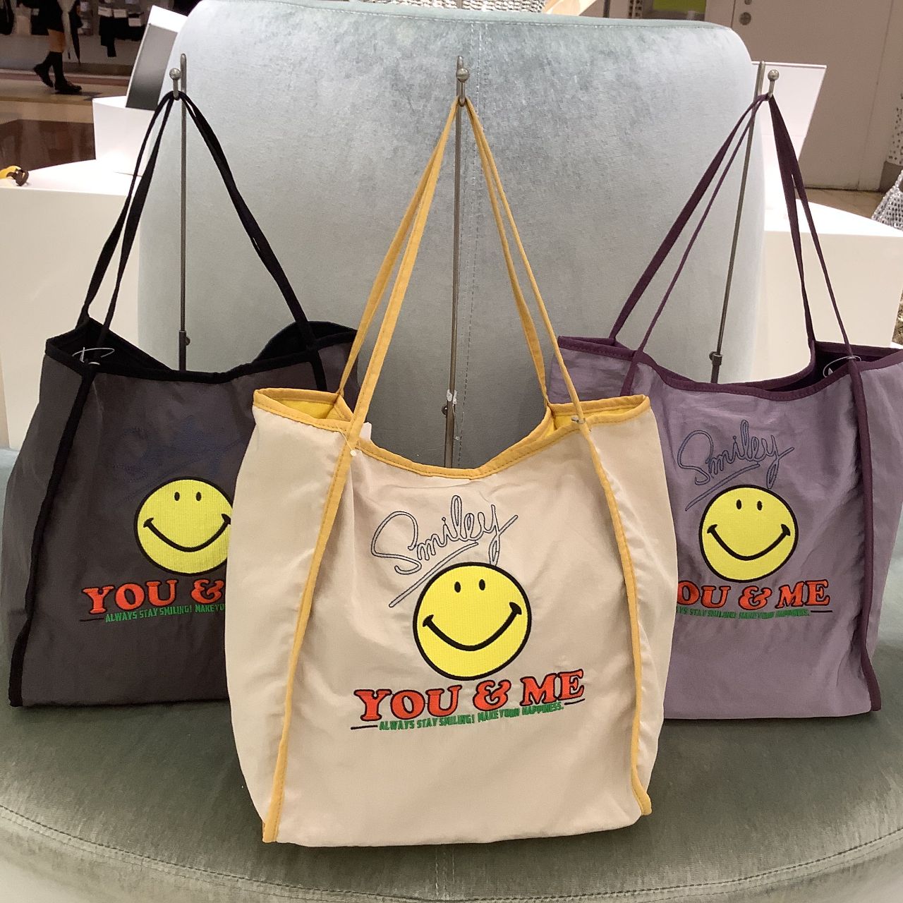 持つだけでみんながハッピーになれそうなスマイルモチーフを刺繍したトートバッグ。