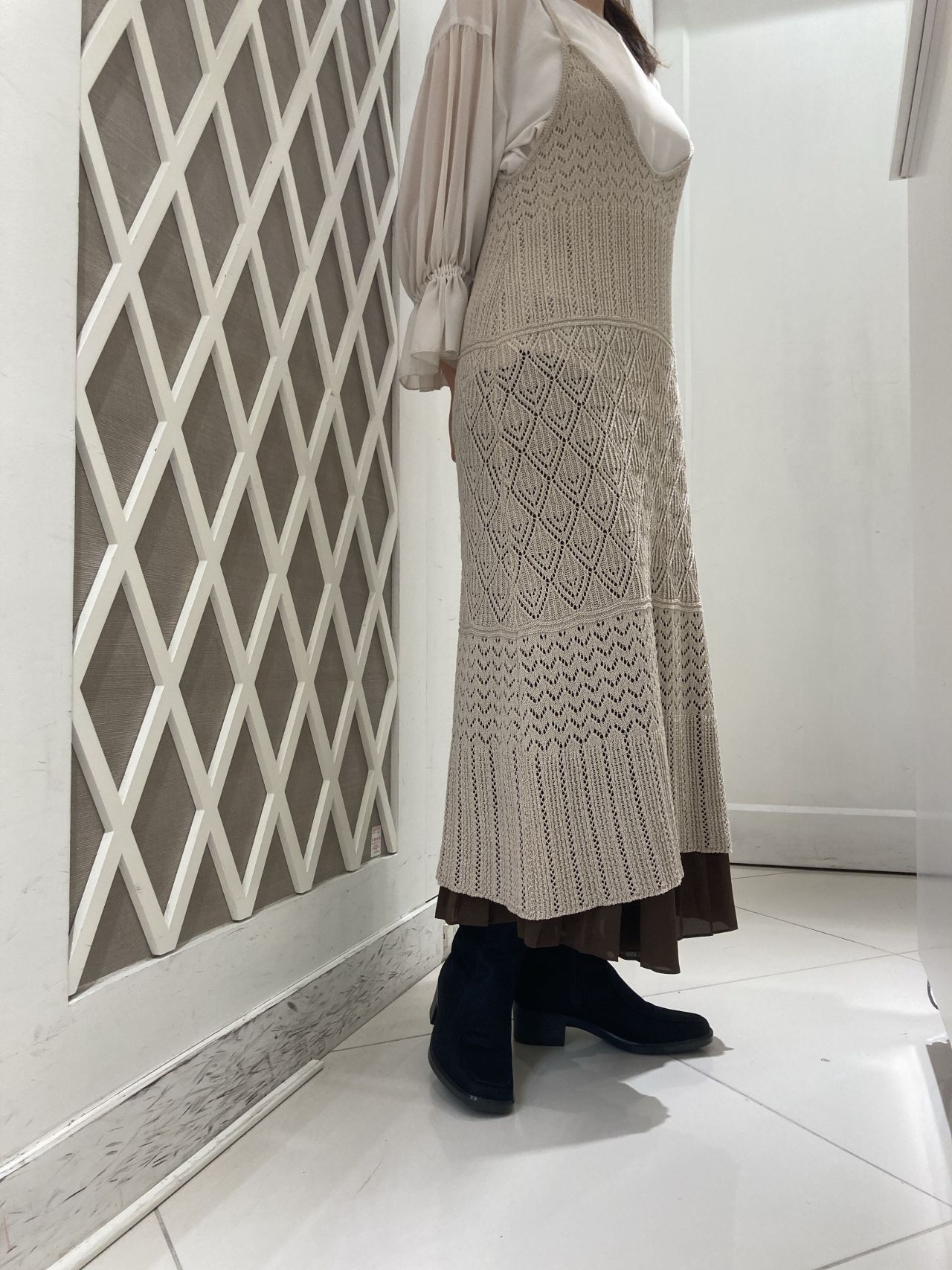 マキシ丈ワンピースにあわせたスタイルで。マットな素材感なので、普段のコーディネートにも合わせて頂きやすいです★
