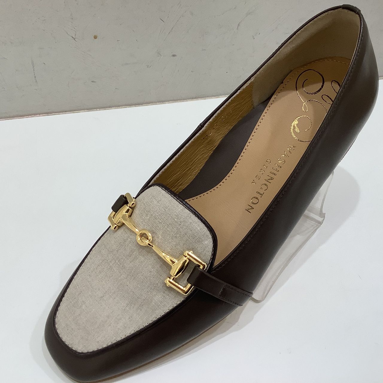 ダークブラウンの革と生地のコンビでオシャレな一足に仕上がっています。