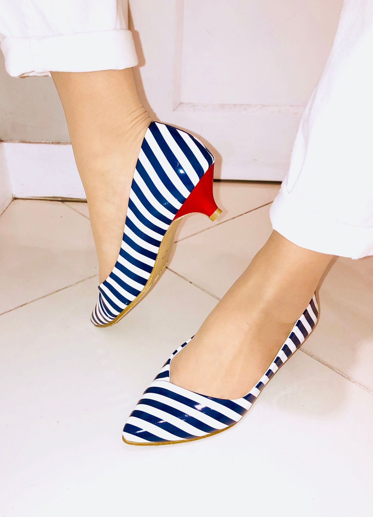 しましま模様のネイビーコンビはエナメルなのに