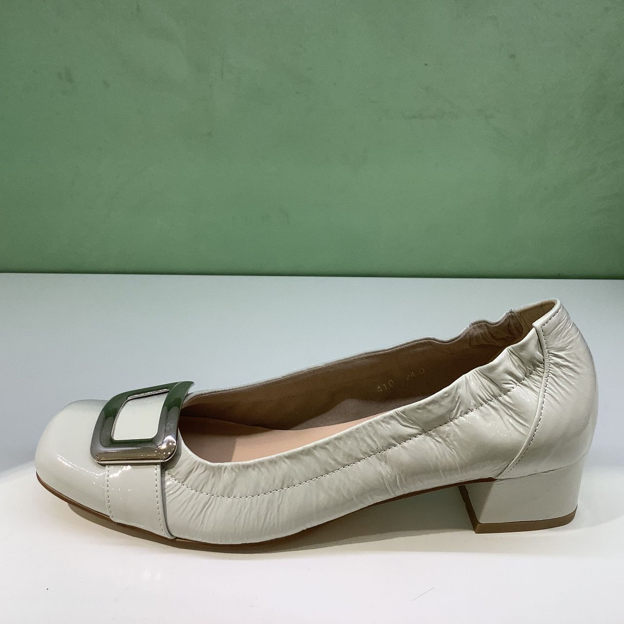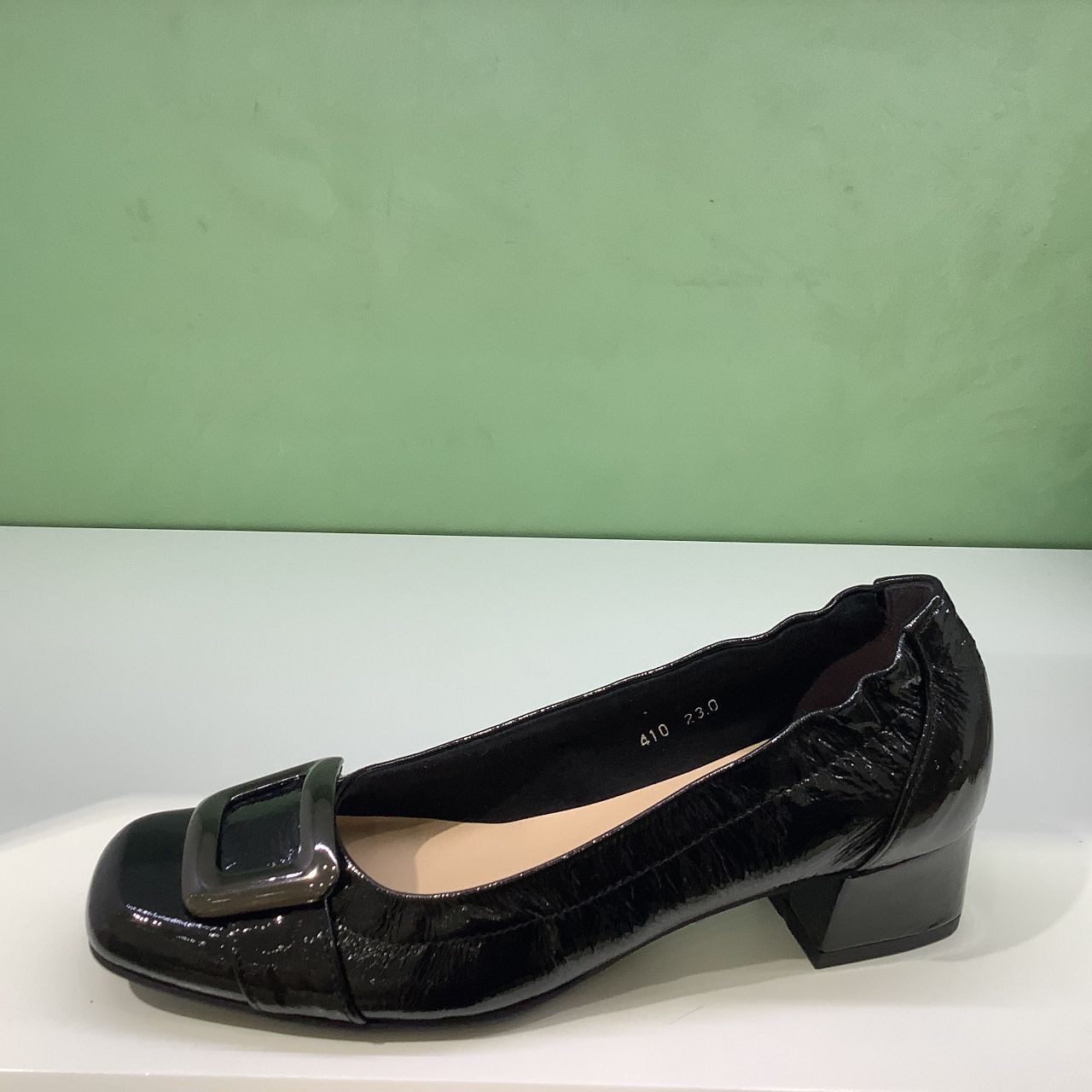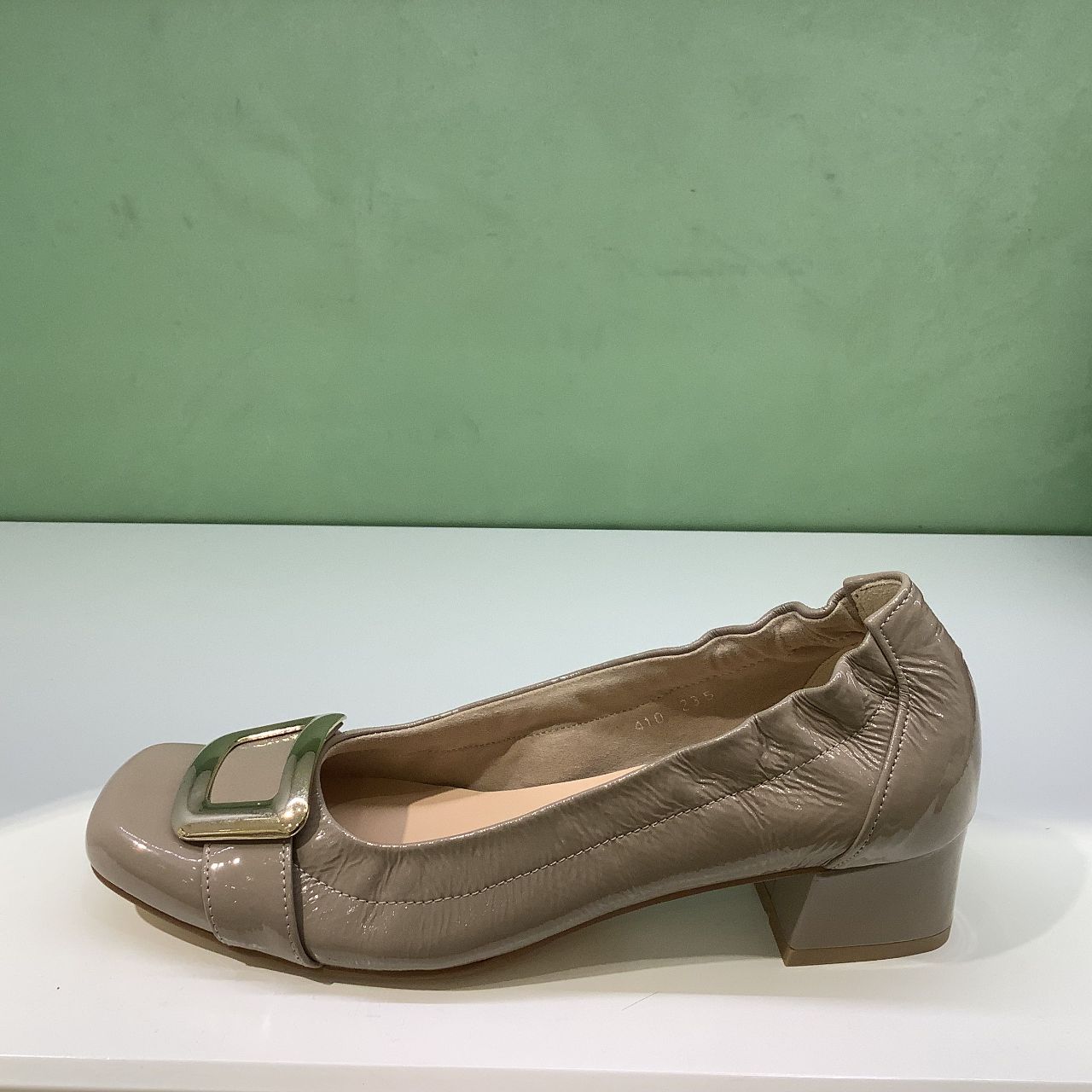エナメル加工ですが柔らかい履き心地で、かかとのギャザーでフィット感があり、太めのヒールで安定感も抜群です。